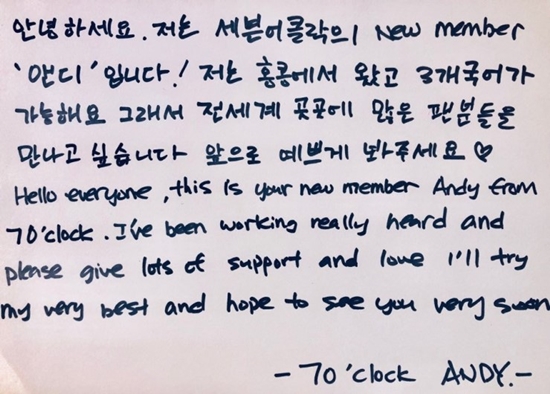 팬카페에 자필편지로 첫인사 했음
