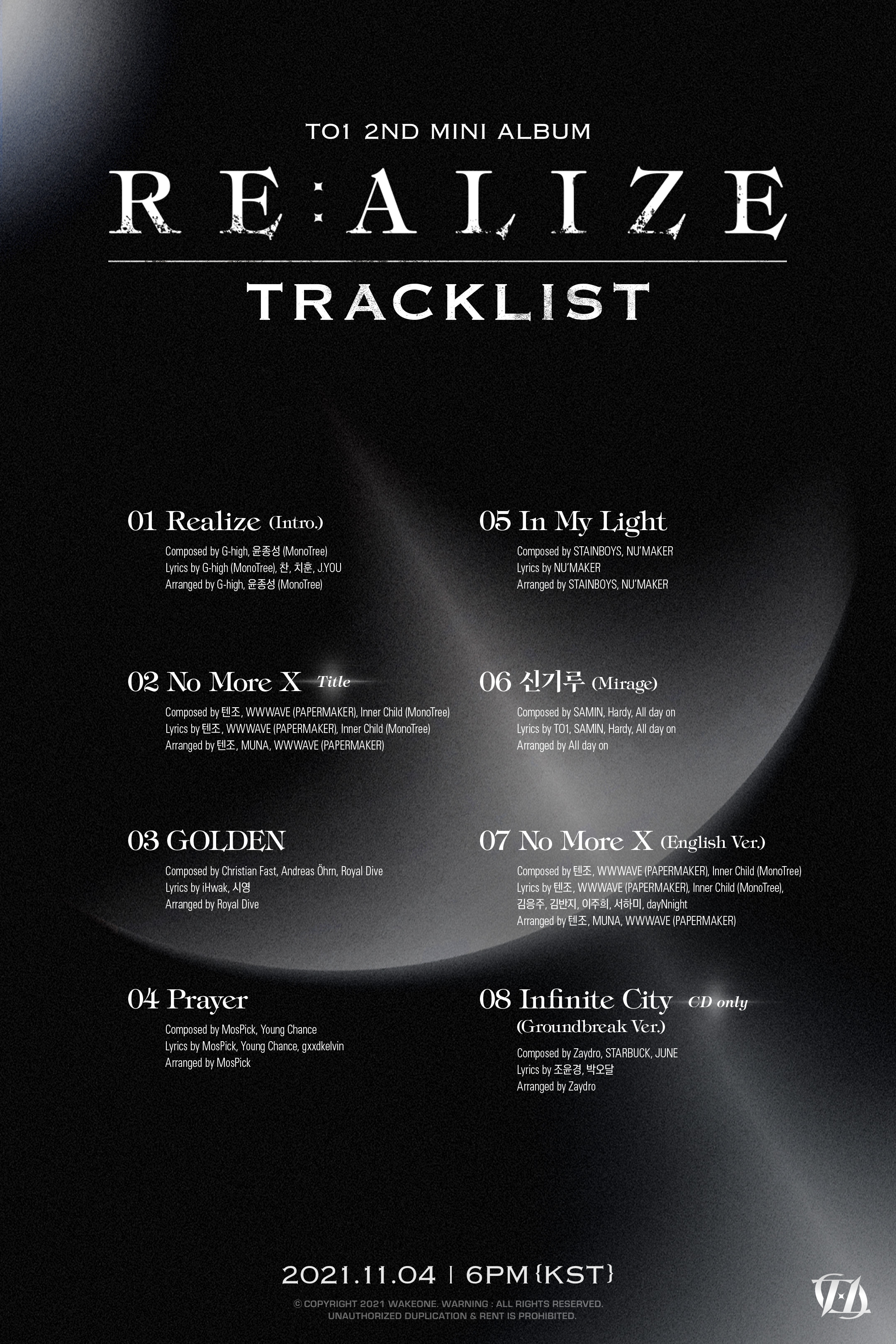 TO1의 미니 2집 '리:얼라이즈(RE:ALIZE)'는 오는 11월 4일 오후 6시 각종 온라인 음원사이트를 통해 발매된다.
