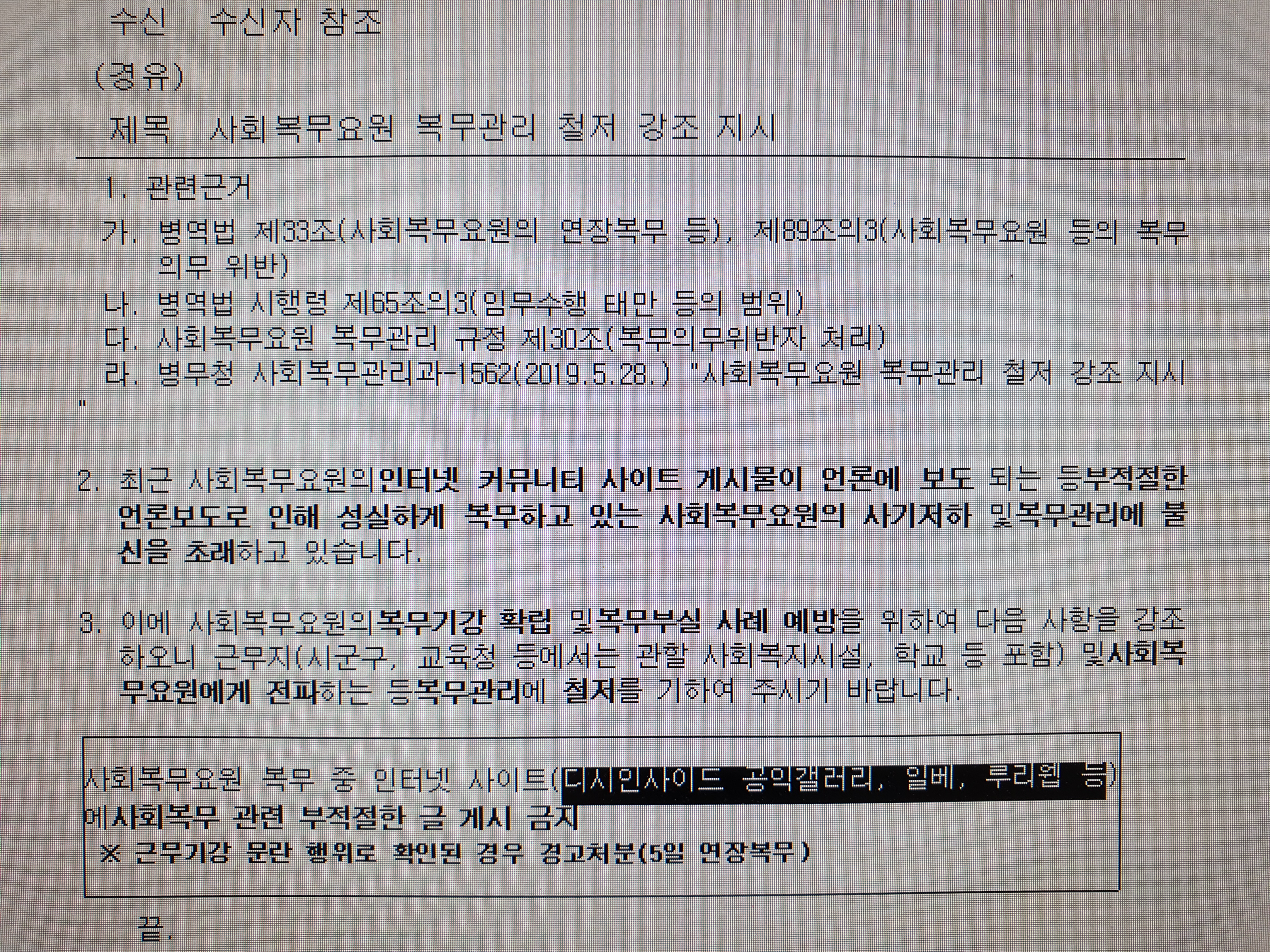 30일 인터넷커뮤니티 등에 따르면 사회복무요원과 복무기관 담당자가 인증 후 접속할 수 있는 사회복무포털에 최근 '사회복무요원 복무관리철저 강조 알림'이라는 공지사항이 게재됐다. 내용을 살펴보면 "최근 사회복무요원의 인터넷 커뮤니티 사이트 게시물이 언론에 보도되는 등 부적절한 언론보도로 인해 성실하게 복무하고 있는 사회복무요원의 사기저하 및 복무관리 불신을 초래하고 있다"며 "사회복무요원 복무 중 인터넷사이트에 사회복무 관련 부적절한 글 게시를 금지한다"는 등의 내용이 적혀있다.