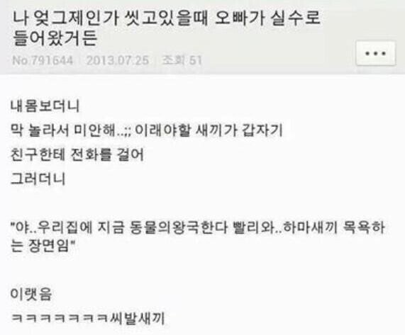 여동생 샤워중에 잘 못 들어간 오빠