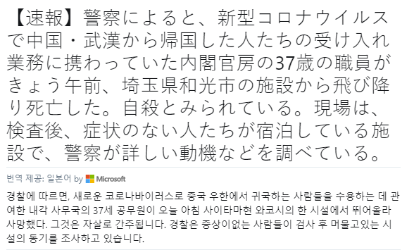 우한에서 일본으로 귀국한 사람들 중 검사를 받은 후 바이러스 증상이 없는 인원들이 숙박을 하는 시설에서 업무를 보던 내각관방 직원이 뛰어내려 자살. 이유 조사중