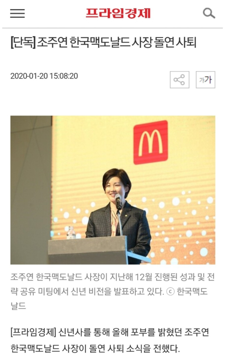 조주연 한국맥도날드 사장 돌연 사퇴