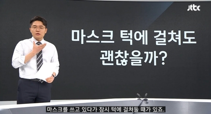 예를 들어 사무실에서 회의, 발표를 할 때, 잠깐 물을 마시거나 전화 통화할 때, 흡연장에서 이렇게 턱에 걸치는 경우가 많음
